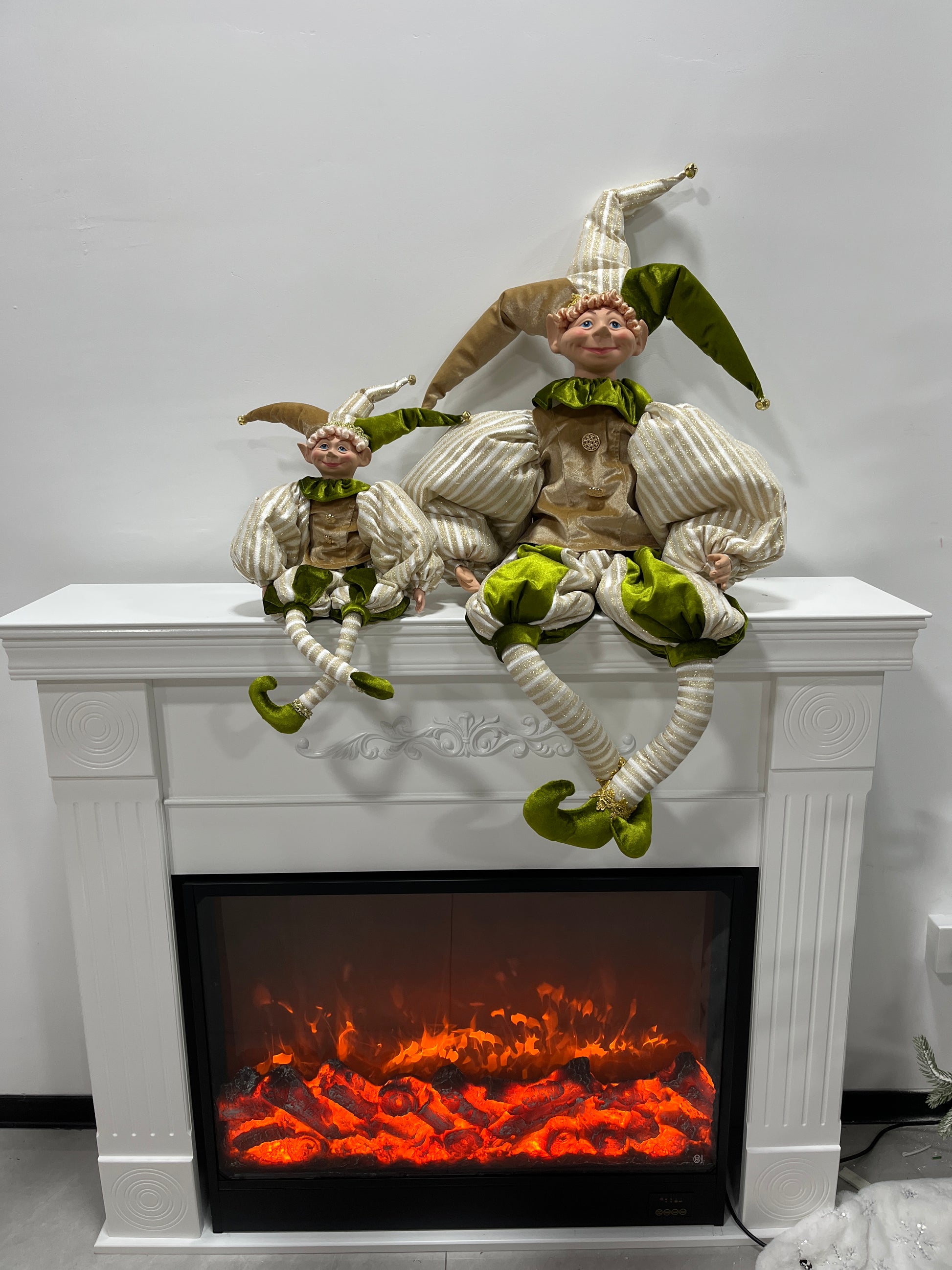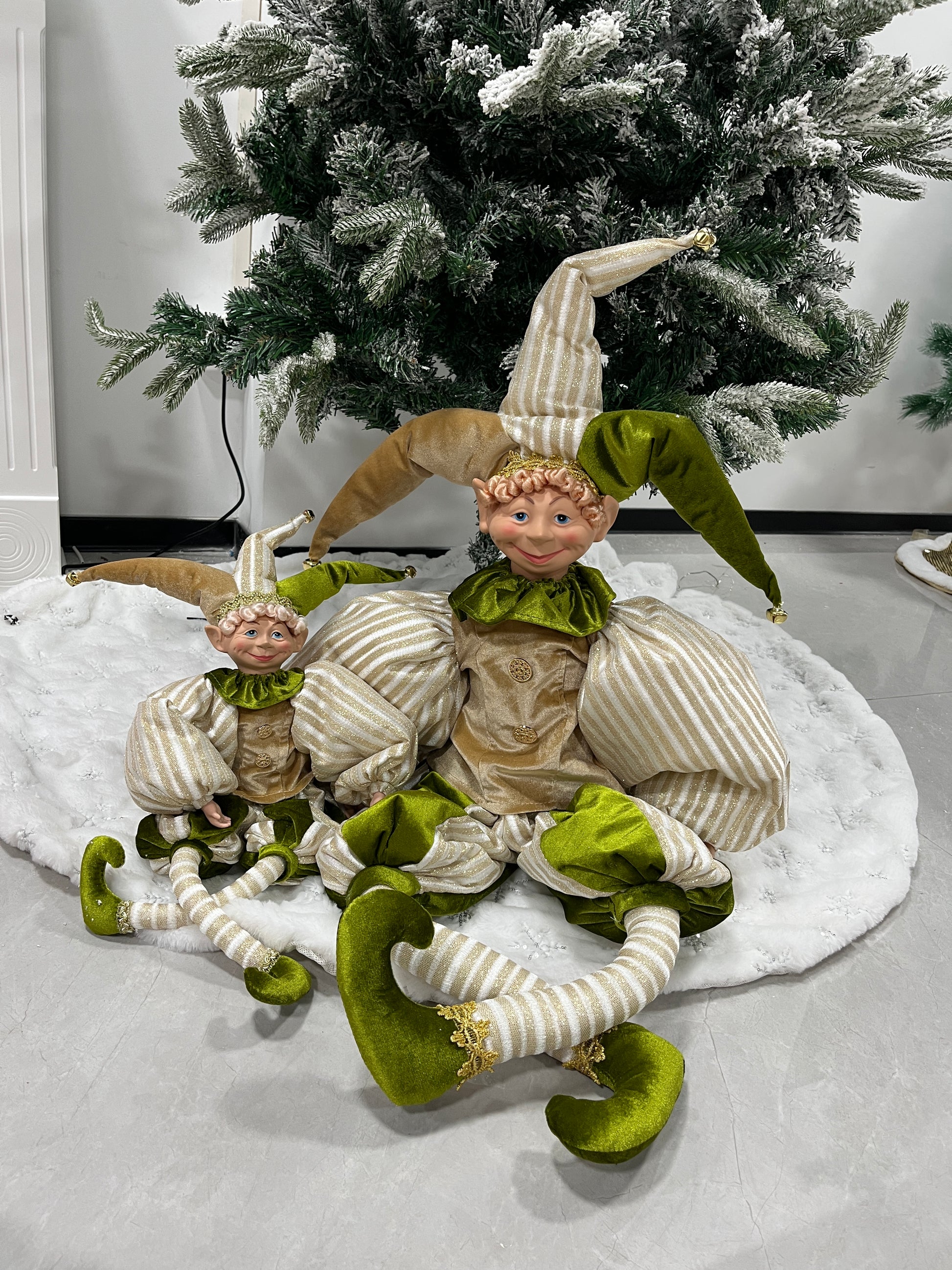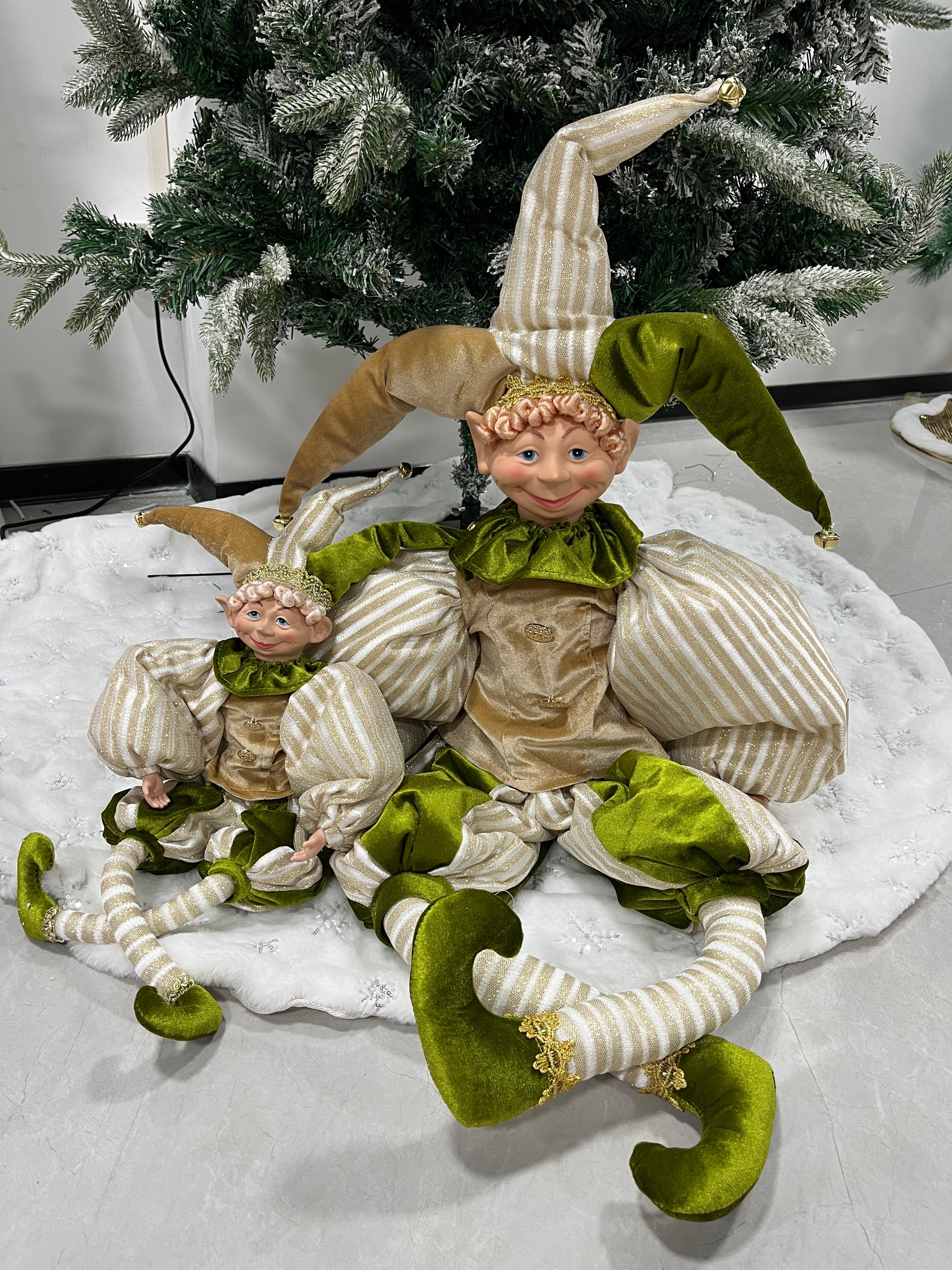 This charming set includes 1 large and 1 small jester-style decor doll, perfect for adding festive cheer to your Christmas setup! Crafted with soft, striped fabric (gold, white & green tones) and adorned with delicate details—like glittering gold headbands, ruffled green collars, and tiny bell accents on the jester hats—these dolls blend classic holiday charm with whimsical design.